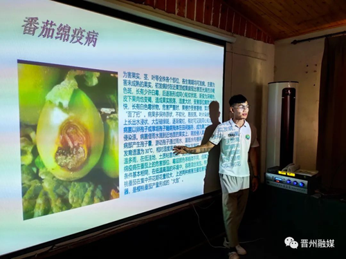 活动中,金农庄园技术员带领果农在番茄种植棚内进行实践操作指导。随后,星创天地专家以授课的方式,围绕番茄病虫害防治和管理要求等,进行深入细致的讲解,用通俗易懂的语言讲授丰富的农技知识。